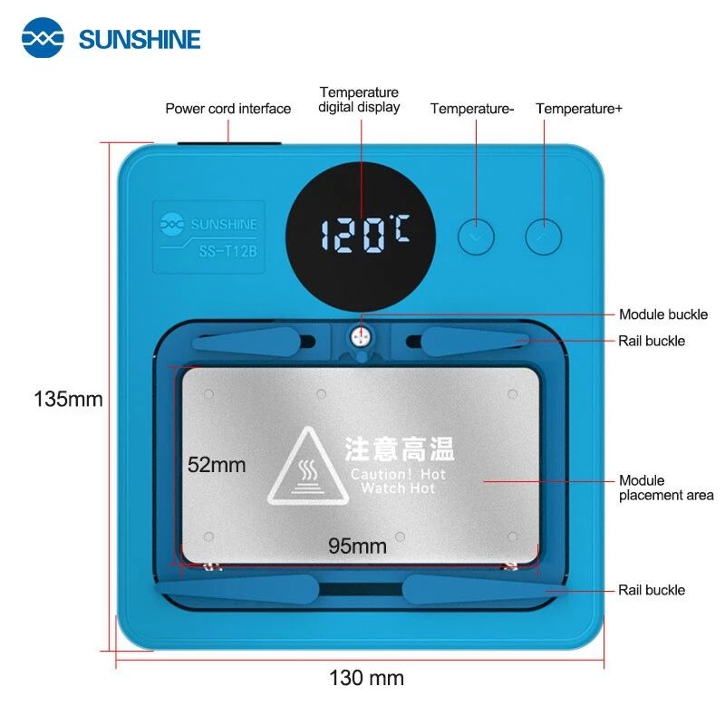 La plateforme de chauffe SUNSHINE SS-T12B est un équipement indispensable pour les ateliers de réparation mobile spécialisés sur iPhone. Dotée d’un système de régulation thermique intelligent et d’un affichage numérique précis, elle garantit une montée en température stable et efficace afin de ramollir les adhésifs sans endommager les composants internes.