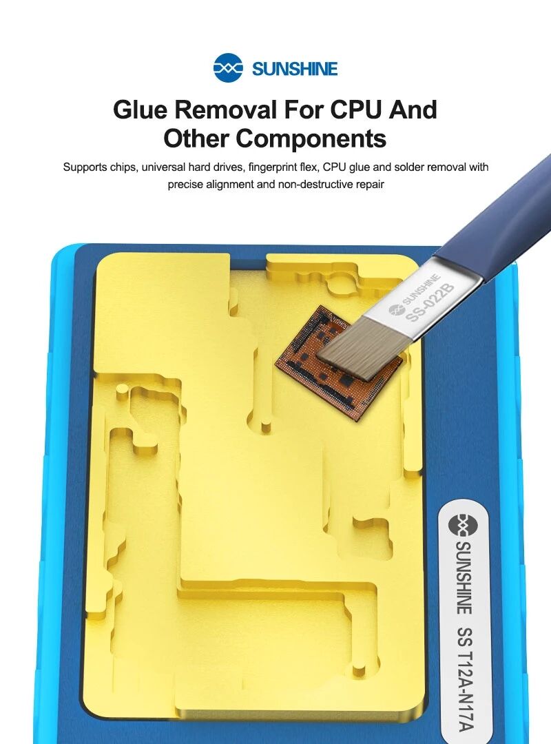 Le Station de chauffe pour carte mère série iPhone 17 / 17 Pro Max SUNSHINE SS-T12A-N17A est un système de chauffe spécialisé pour le démontage des cartes mères d’iPhone 17, iPhone 17 Pro Max.. Développé pour répondre aux exigences de la micro-réparation Apple, il fournit une chaleur homogène et parfaitement contrôlée, permettant de ramollir l’adhésif de fixation tout en préservant l’intégrité des circuits électroniques sensibles.
