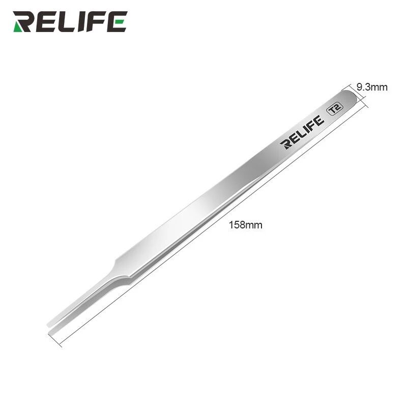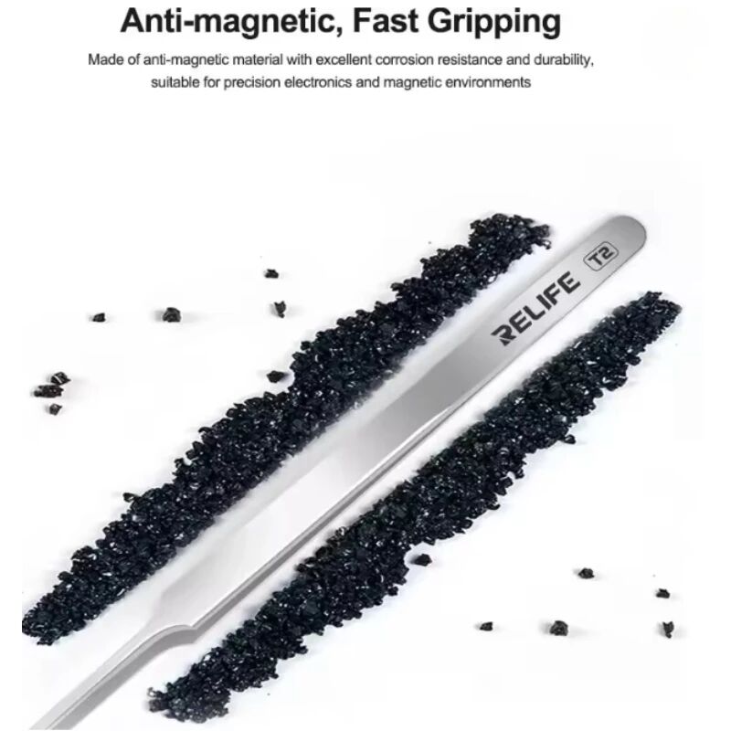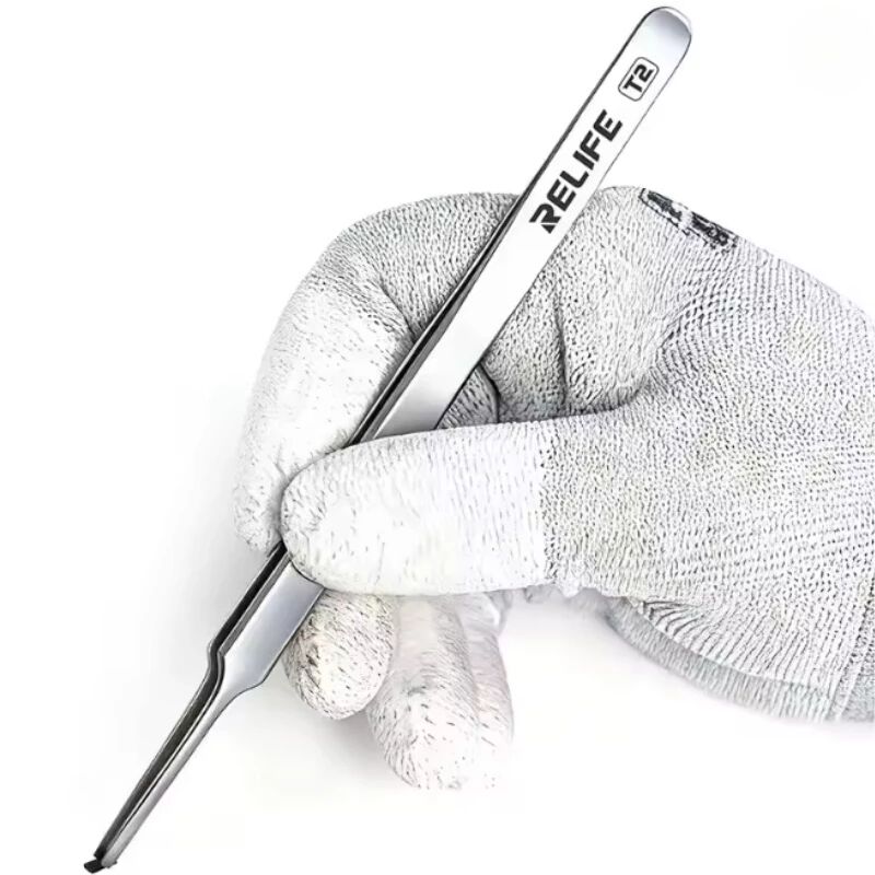 La pince de précision RELIFE T2 est un outil professionnel destiné aux techniciens en réparation électronique et micro-soudure. Grâce à ses pointes plates arrondies et prolongées, elle offre une surface de contact optimisée permettant de saisir, positionner et maintenir avec précision des composants, nappes et fils délicats sans les marquer.