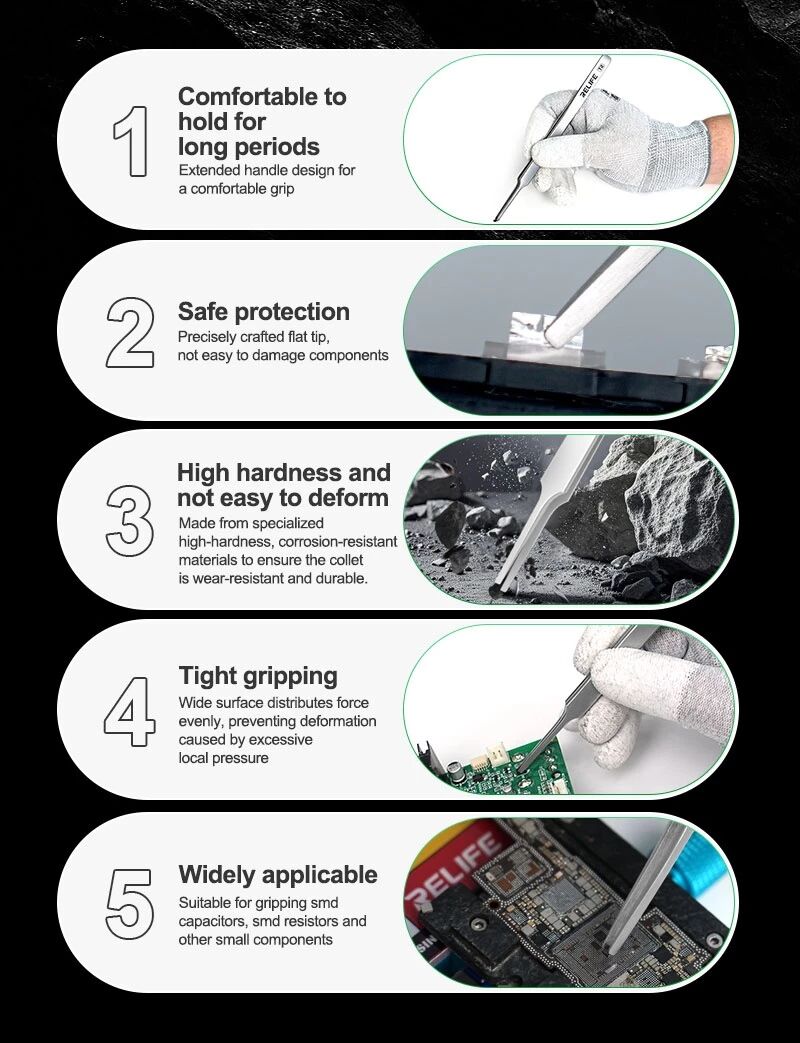 Sa conception allongée facilite l’accès aux zones étroites ou profondes des cartes mères et modules électroniques, garantissant une manipulation stable et contrôlée. Robuste et ergonomique, la RELIFE T2 est parfaitement adaptée à un usage intensif en atelier, assurant confort et fiabilité sur le long terme.