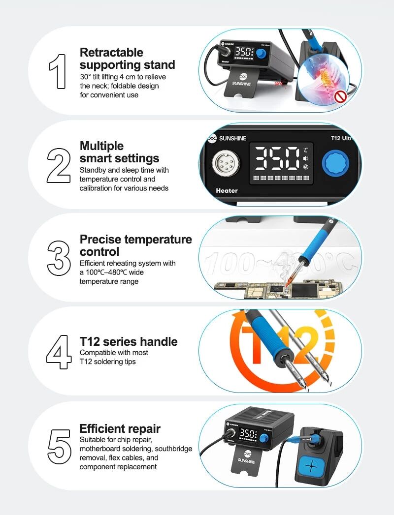 Robuste et conçue pour un usage intensif en atelier, la SUNSHINE T12 ULTRA est idéale pour les interventions de précision, le rework PCB et la réparation professionnelle de dispositifs électroniques.