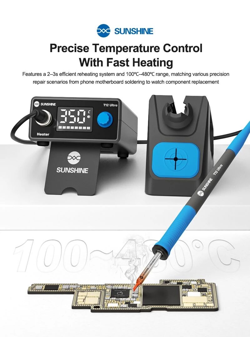 La station de soudage SUNSHINE T12 ULTRA a été développée pour répondre aux exigences des techniciens professionnels en réparation électronique, smartphones et cartes mères. Équipée d’un système de régulation thermique avancé, elle garantit une température stable et précise, indispensable pour travailler sur des composants sensibles et des circuits haute densité.