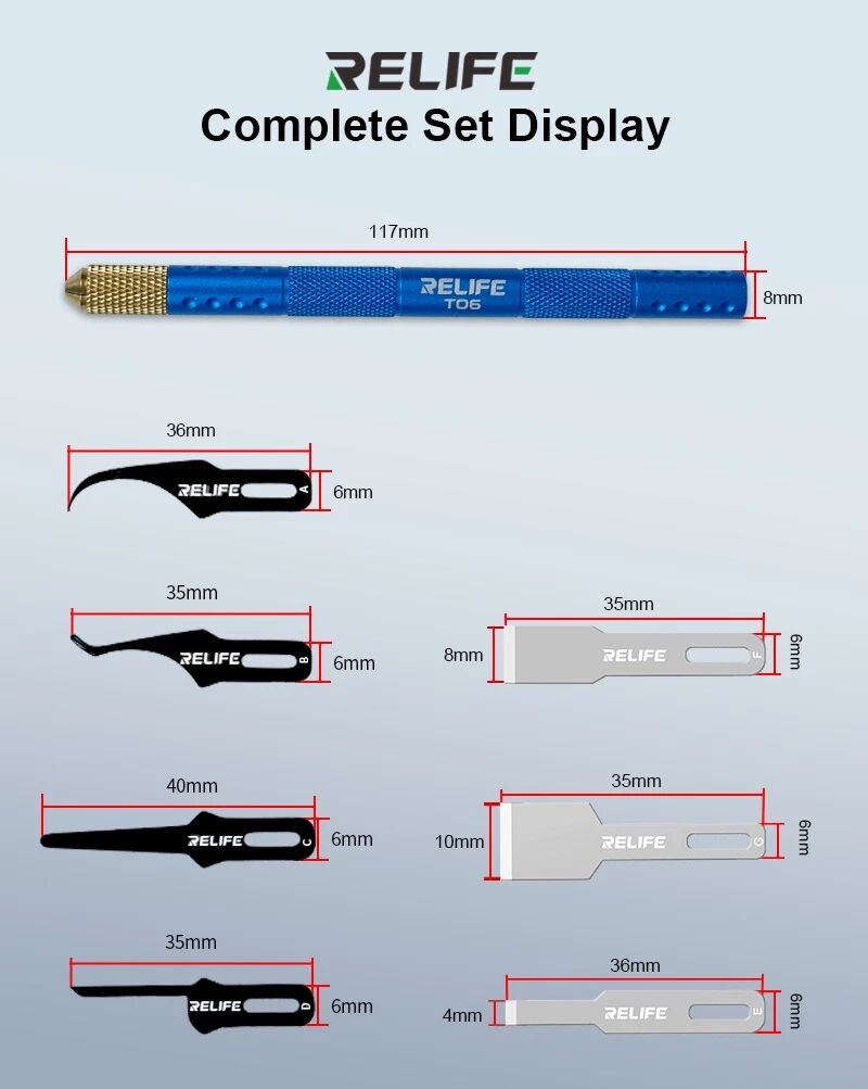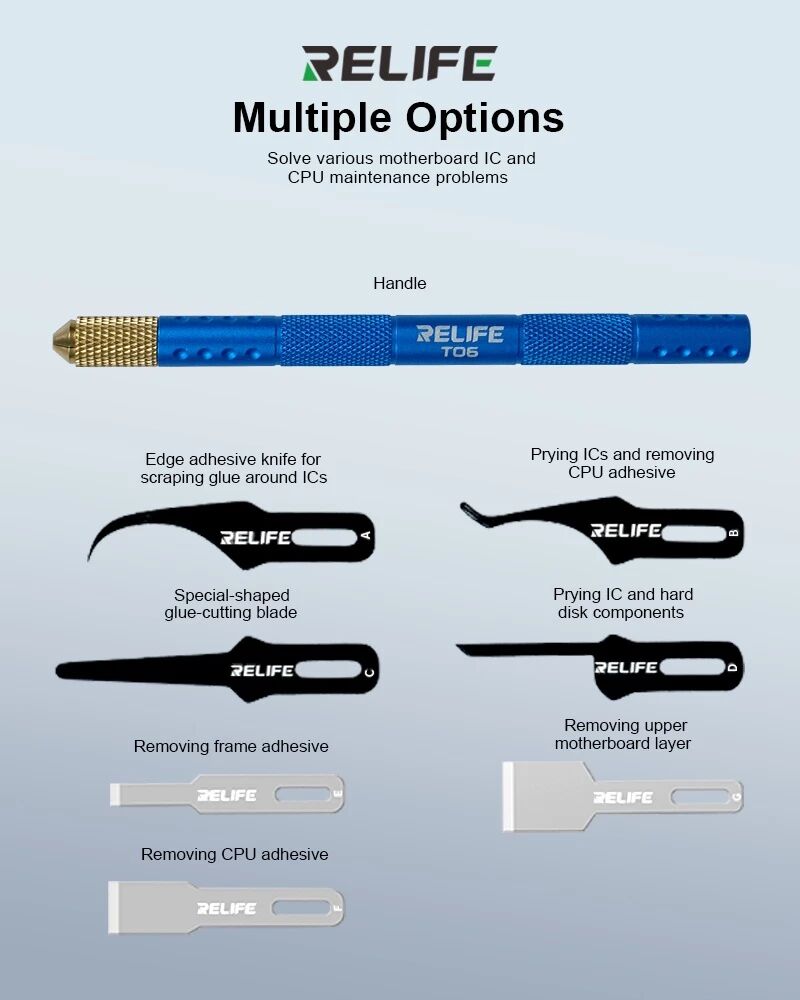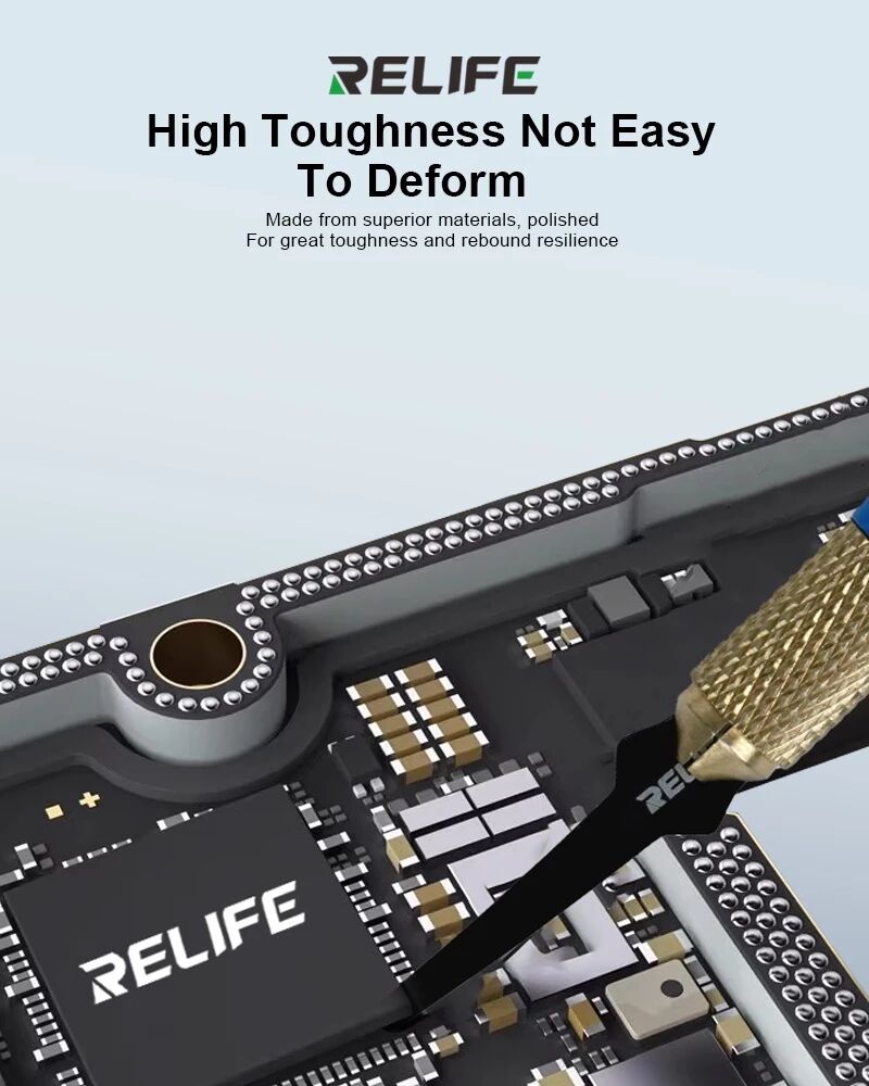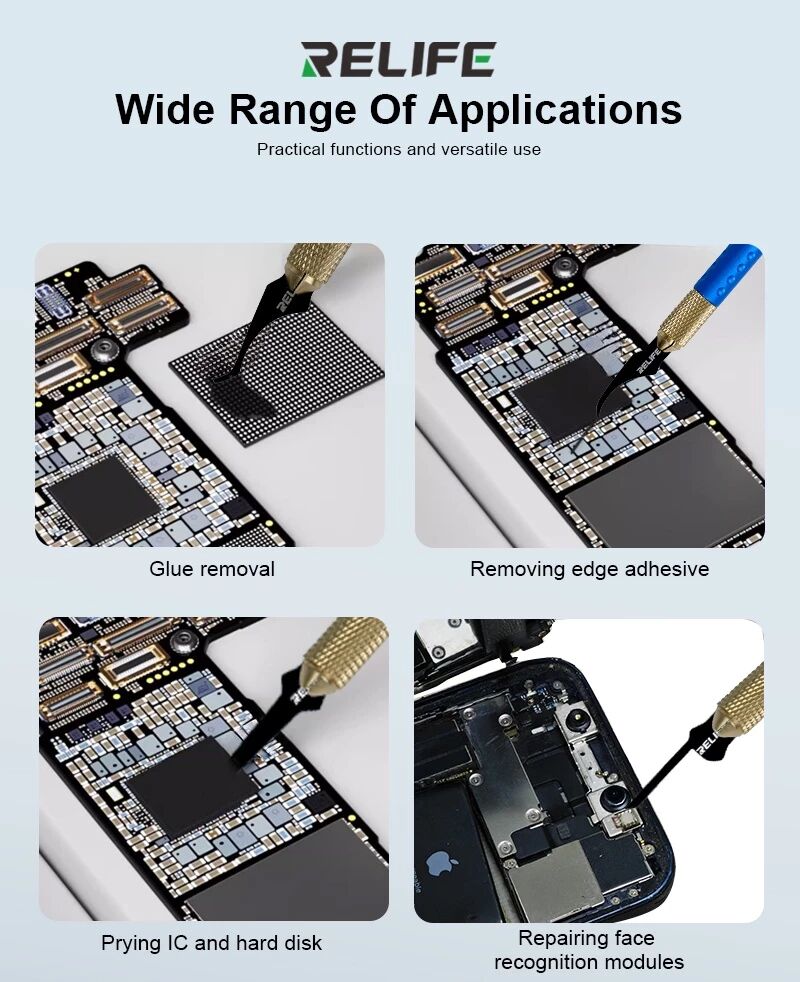 Le RELIFE TK5 est un kit professionnel de 8 lames de précision spécialement conçu pour les techniciens en réparation électronique, microsoudure et maintenance de cartes mères. Polyvalent et ergonomique, il permet d’effectuer des tâches délicates telles que le retrait de colle, la séparation de composants, le levage précis de circuits intégrés, ainsi que les opérations fines sur CPU et PCB.