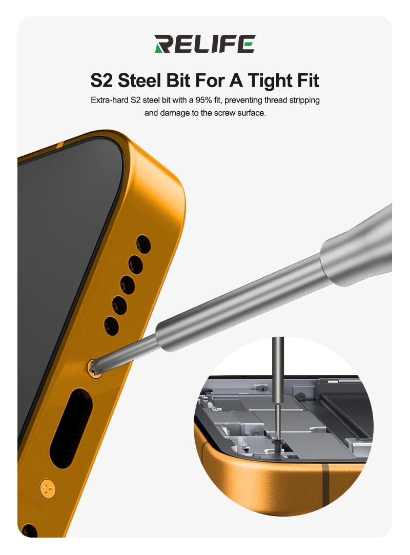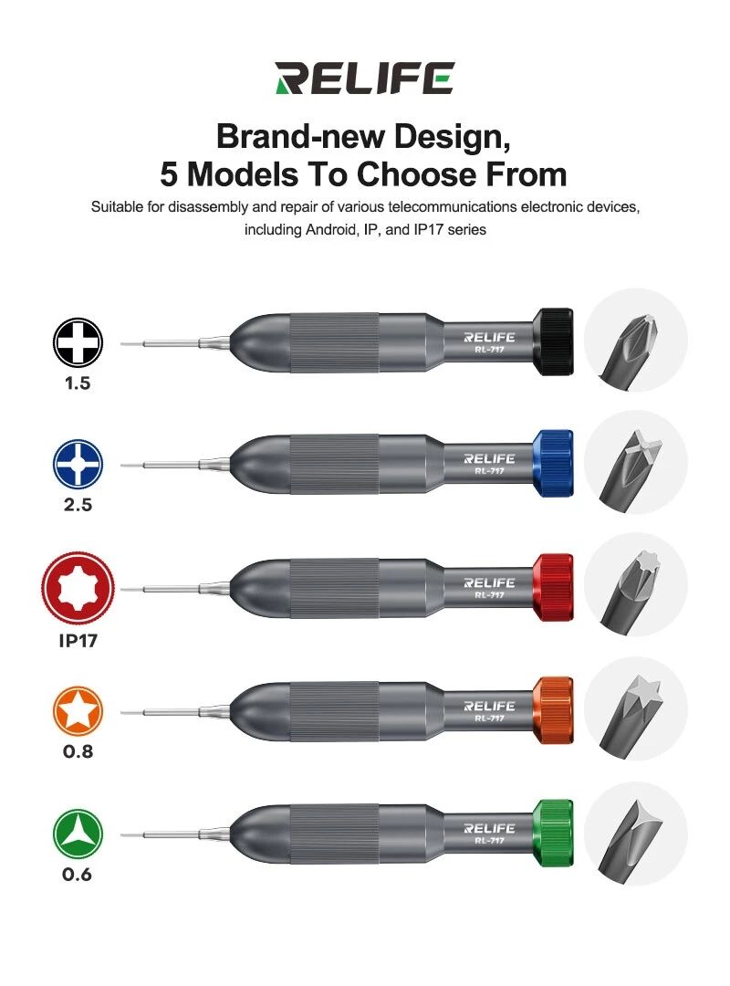 Le RELIFE RL-717 est un kit professionnel de tournevis de précision destiné aux techniciens en réparation électronique, smartphones et microsoudure. Chaque tournevis est équipé d’une tête rotative (Rocket Head) permettant un vissage fluide et précis tout en réduisant la fatigue de la main lors des interventions prolongées.