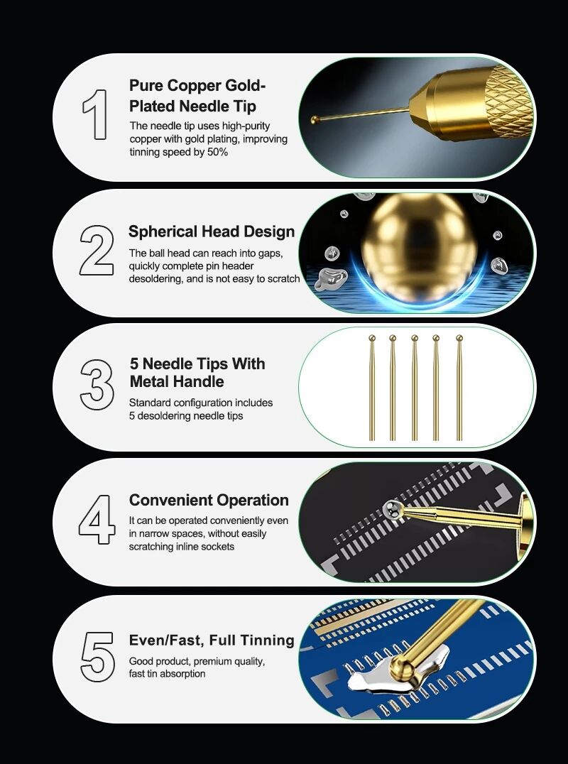 Le manche ergonomique en métal assure une excellente prise en main et une grande stabilité lors des opérations délicates. Les aiguilles de haute précision offrent une résistance élevée à la chaleur et permettent une intervention ciblée sans endommager les pistes ou composants environnants.