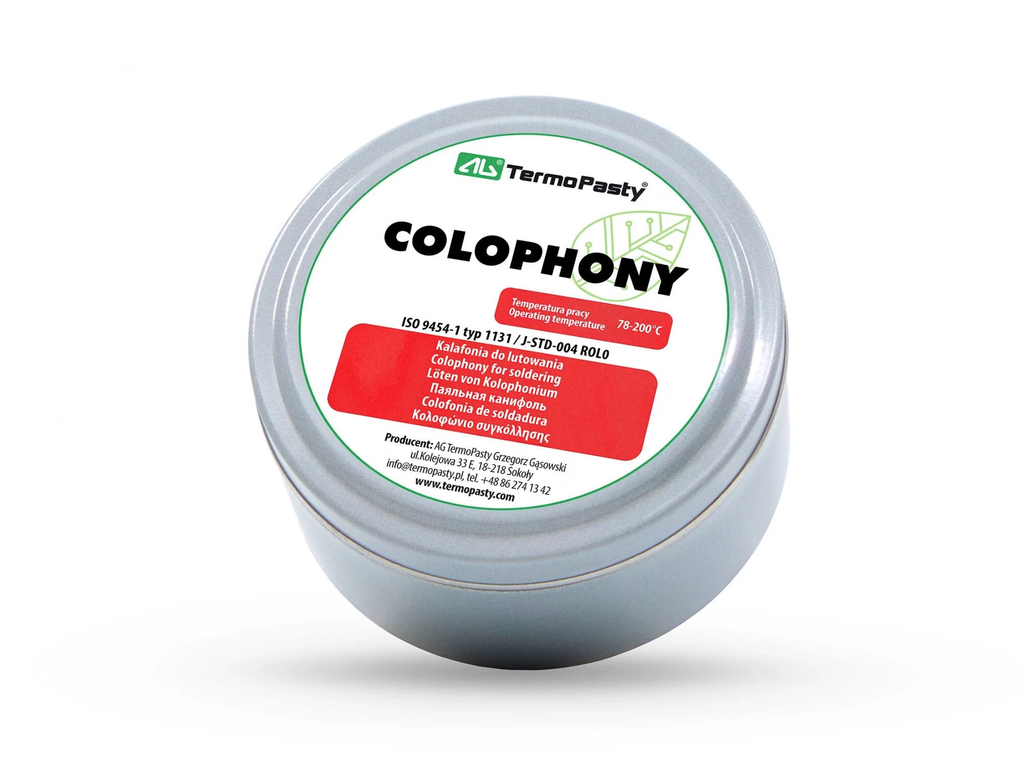 La colophane (Kalafonia) est une résine naturelle utilisée comme flux de soudure dans les applications électroniques et électrotechniques. Elle permet de nettoyer les surfaces métalliques en éliminant les oxydes présents sur les pistes de circuits imprimés et les pattes des composants avant et pendant l’opération de brasage.