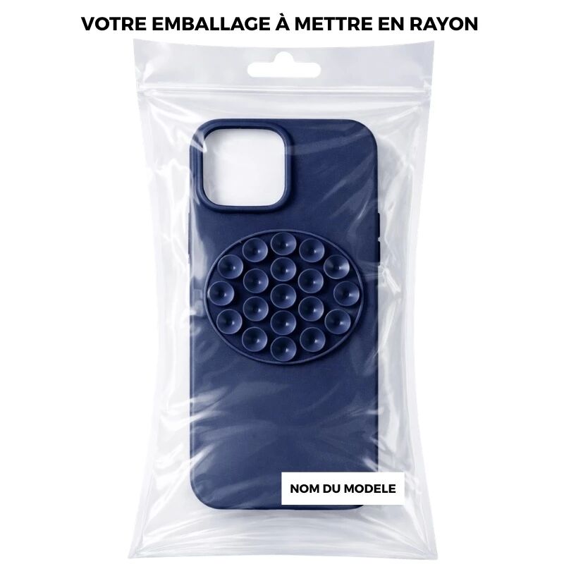 Coque en silicone avec ventouses arrière intégrées pour fixation sur surfaces lisses. Protection efficace contre chocs et rayures, compatible MagSafe et charge sans fil. Fonctionnelle et différenciante en point de vente.