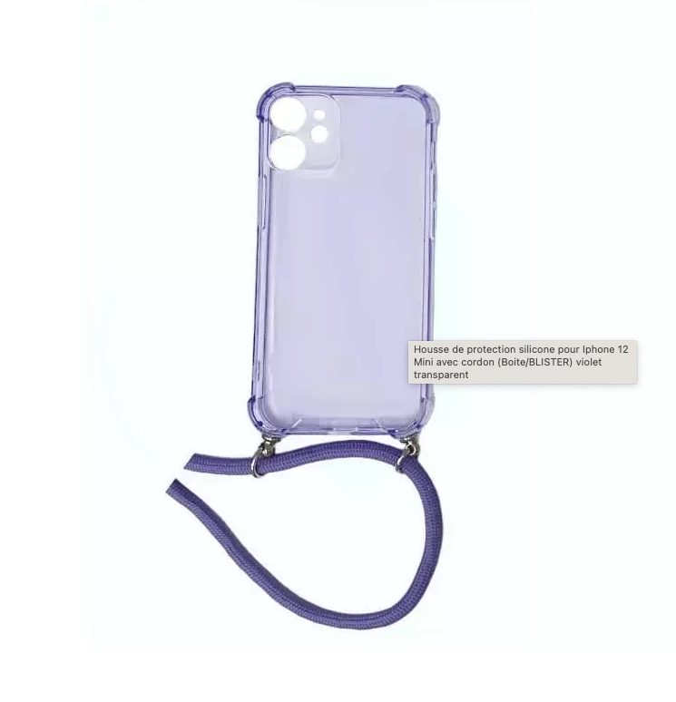 Accueil > Accessoires > Protection > Housse de protection > Housse-coque silicone iPhone 12 Mini / iPhone 13 Mini + cordon (Boite/blister) violet transparent