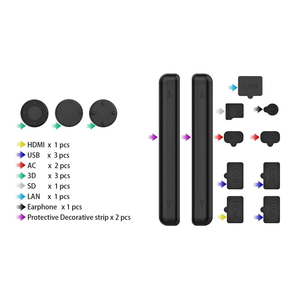- Contenu du kit : HDMI × 1, USB × 3, AC × 2, Capuchons joystick 3D × 3, SD × 1, LAN × 1, Prise casque × 1, Bandes décoratives protectrices × 2.