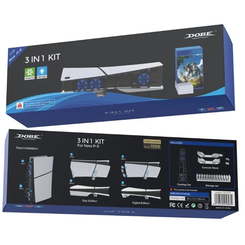 Le kit 3-en-1 DOBE TP5-35129 est spécialement conçu pour la PS5 Slim. Il intègre un système de contrôle intelligent de la température assurant une dissipation thermique efficace pour maintenir les performances de la console. Le ventilateur inclut un éclairage ambiant bleu, facile à installer et silencieux.