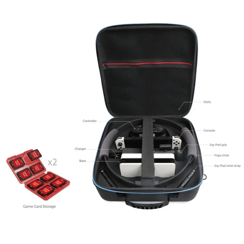 - Contenu du set : Pochette de transport TNS-2157, 2 boîtes de rangement TNS-19303, console Nintendo Switch (emplacement prévu), dock d’origine (emplacement), Joy-Con (paire), manette Pro, manette Switch standard, anneau Fitness Ring, dragonnes Switch, accessoires divers.