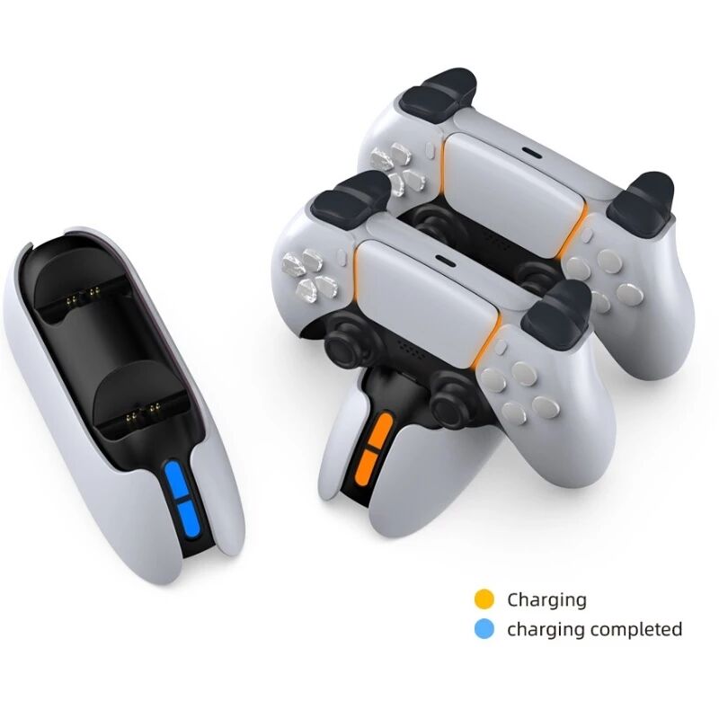 Grâce à une alimentation DC 5V/3A, elle permet de charger deux manettes PS5 en même temps, tout en affichant clairement l’état de charge via une fenêtre bicolore bleu/orange située à l’avant.